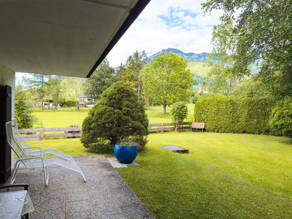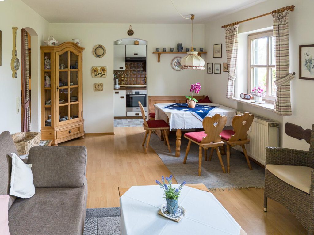 Diese ruhige 2-Zimmerwohnung ist auf der Gebäuderückseite des Hauses Mariandl gelegen und grenzt unmittelbar ans Grün. Aus dem Wohnraum tritt der Gast unmittelbar auf die große Terrasse mit Garten.